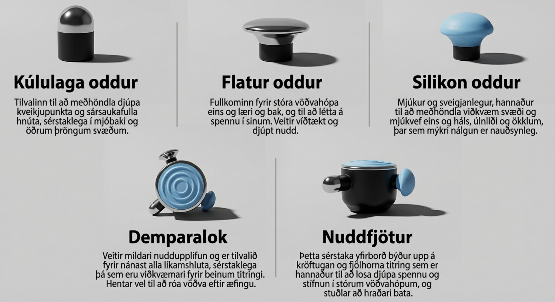 Á Ultrapro eru 5 áfastir nuddfletir (sjá mynd), hún kemur í tösku og með tveimur auka nuddhausum.